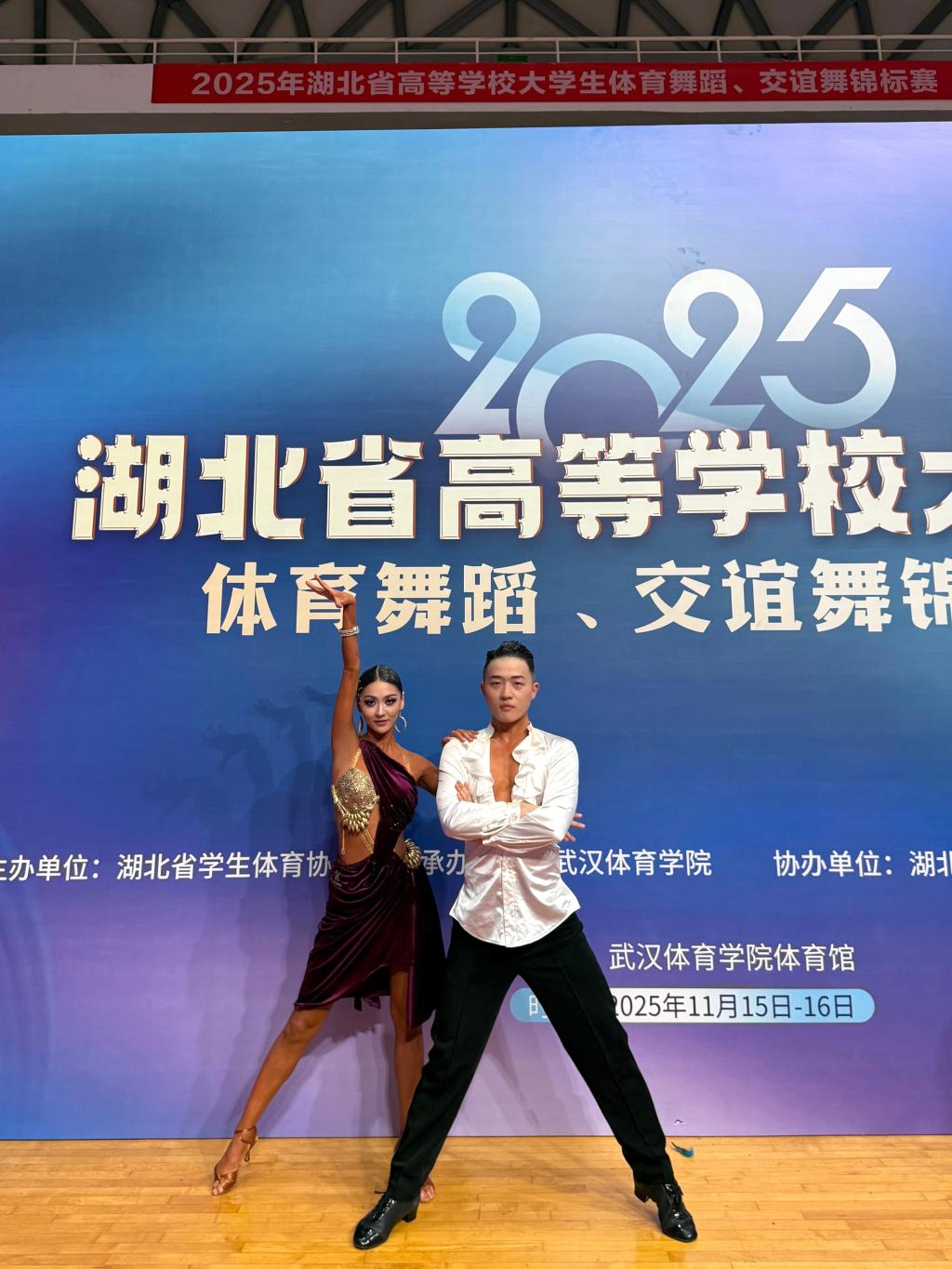 11月15-16日,武汉体育学院承办的体育舞蹈、交谊舞锦标赛汇聚全省43所高校1000余名选手。2024级研究生姜贻丹、范曦搭档发挥出色,凭借扎实功底、流畅衔接与感染力表现,一举包揽大学生甲组E组、D组双人拉丁舞冠军;2025级研究生杜昱霖稳健发挥,获大学生甲组单人拉丁舞第五名。