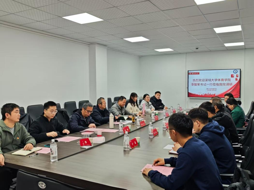 12月18日,深圳大学体育学院党委书记李智军、副院长张得保等一行莅临我院开展党建调研交流活动。双方围绕学院建设发展、党建样板支部建设等议题深入探讨,深化互学互鉴。学院党委书记殷云飞、副院长张强弓及教师代表参与调研交流。