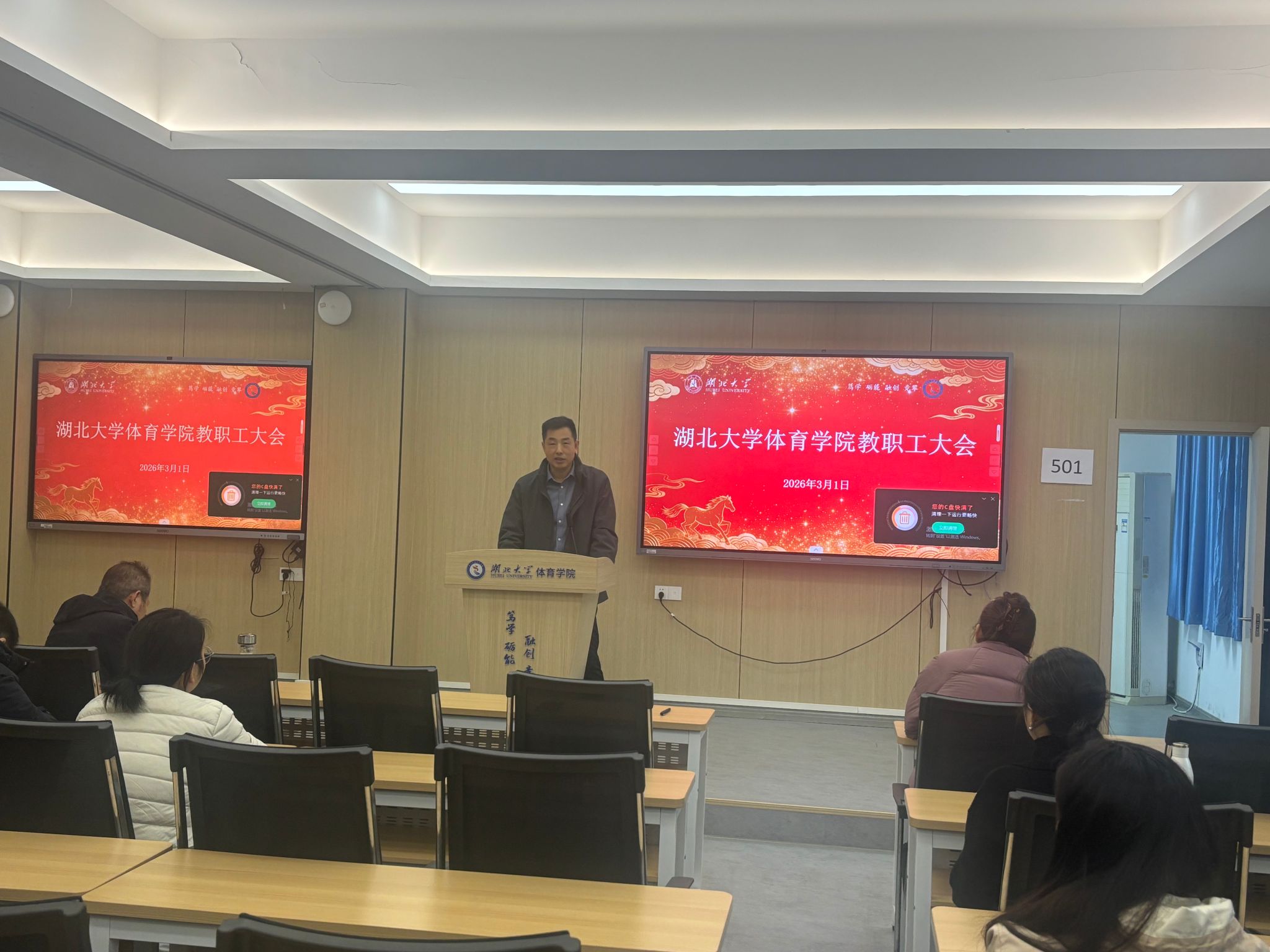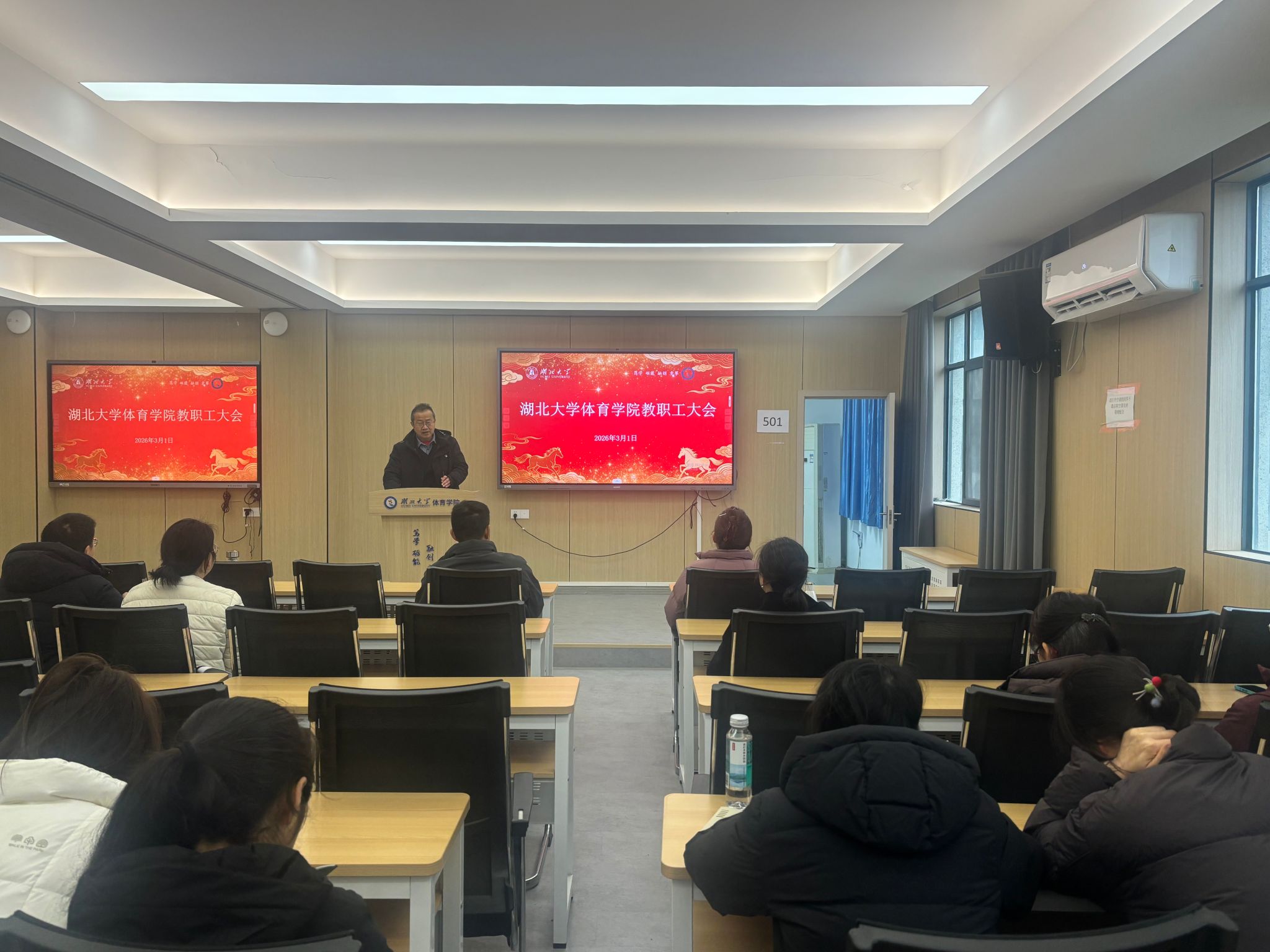 3月1日上午,湖北大学体育学院2026年春季学期第一次全体教职工大会在学院501会议室隆重召开。学院领导班子全体成员及全院教职工齐聚一堂、共商发展,会议全面部署新学期教学科研、学科建设、人才培养、学生管理、后勤保障等重点工作,为学院“十五五”发展规划开好局、起好步。
