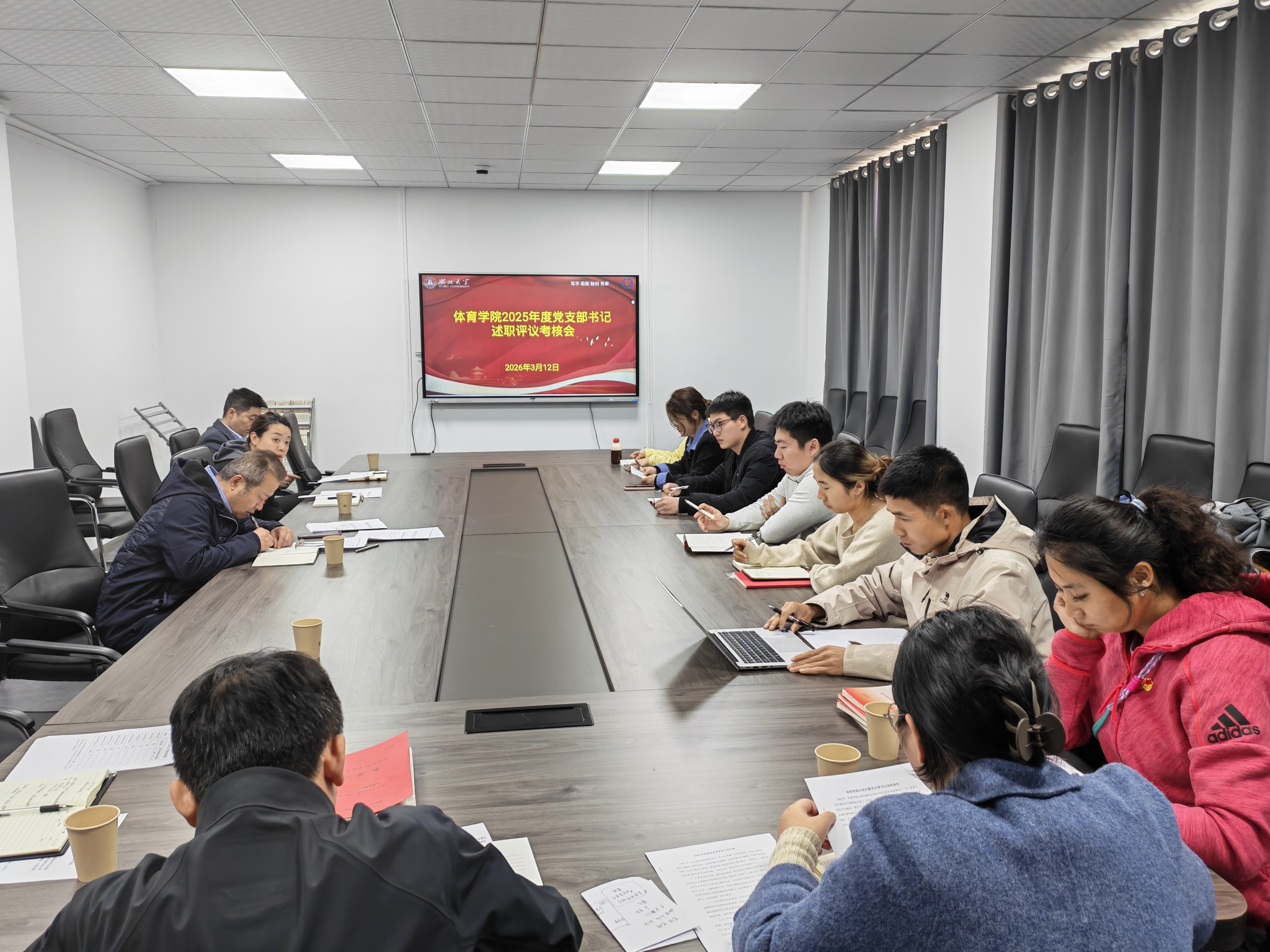 为扎实推进基层党支部标准化规范化建设,压实支部书记抓党建工作主体责任,3月12日下午,体育学院在421会议室召开2025年度党支部书记述职评议考核会。学院领导班子成员及党支部书记参加会议。会议由院党委书记殷云飞主持。